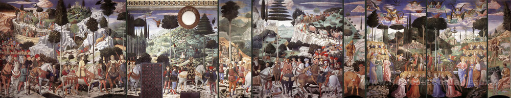 Nous vous proposons une reproduction artisanale sur toile du célèbre tableau 'Procession des mages' de Benozzo Gozzoli, provenant du Musée de la Reproduction.
