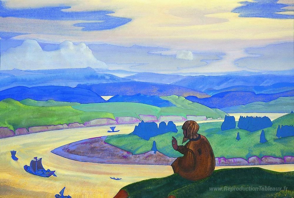 Nous vous proposons une reproduction artisanale sur toile du célèbre tableau 'Procopius le juste prie de navigation inconnue' de Nicholas Roerich, provenant du Musée de la Reproduction.