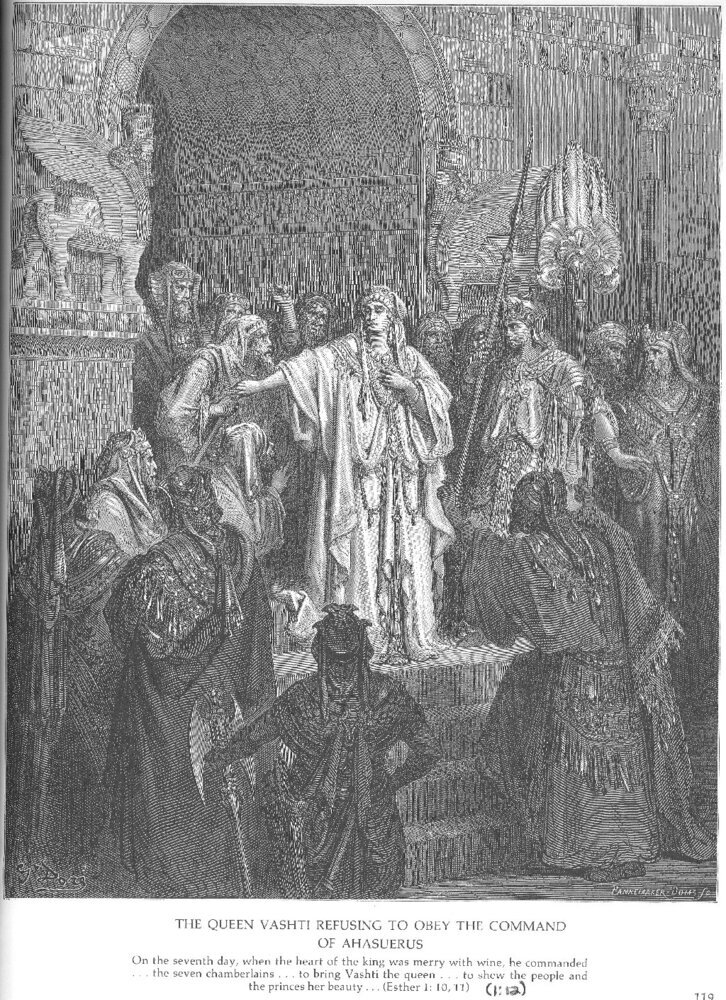 Nous vous proposons une reproduction artisanale sur toile du célèbre tableau 'Queen Vashti refuse d'obéir au commandement d'Ahasuerus' de Gustave Dore, provenant du Musée de la Reproduction.