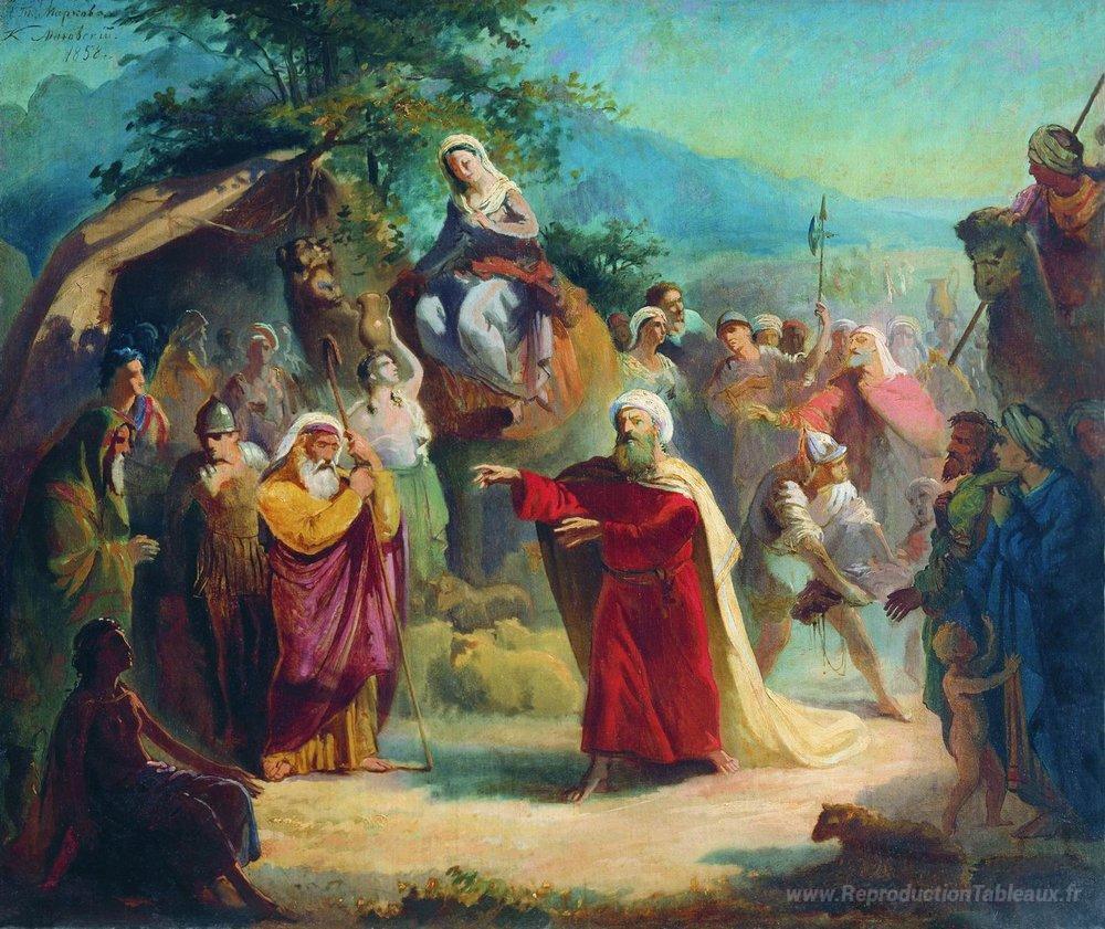 Nous vous proposons une reproduction artisanale sur toile du célèbre tableau 'Réunion d'Isaac et d'Eleazar' de Konstantin Makovsky, provenant du Musée de la Reproduction.