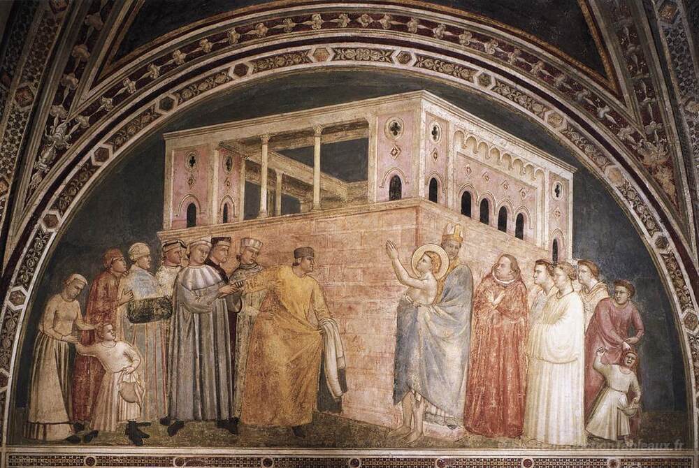 Nous vous proposons une reproduction artisanale sur toile du célèbre tableau 'Saint François renonçant à ses biens mondains' de Giotto, provenant du Musée de la Reproduction.
