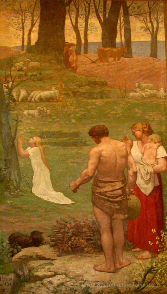 Nous vous proposons une reproduction artisanale sur toile du célèbre tableau 'Saint Geneviève en tant qu'enfant dans la prière' de Pierre Puvis de Chavannes, provenant du Musée de la Reproduction.