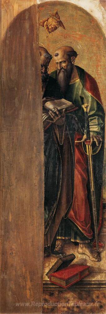 Nous vous proposons une reproduction artisanale sur toile du célèbre tableau 'Saint Pierre et Saint Paul' de Carlo Crivelli, provenant du Musée de la Reproduction.