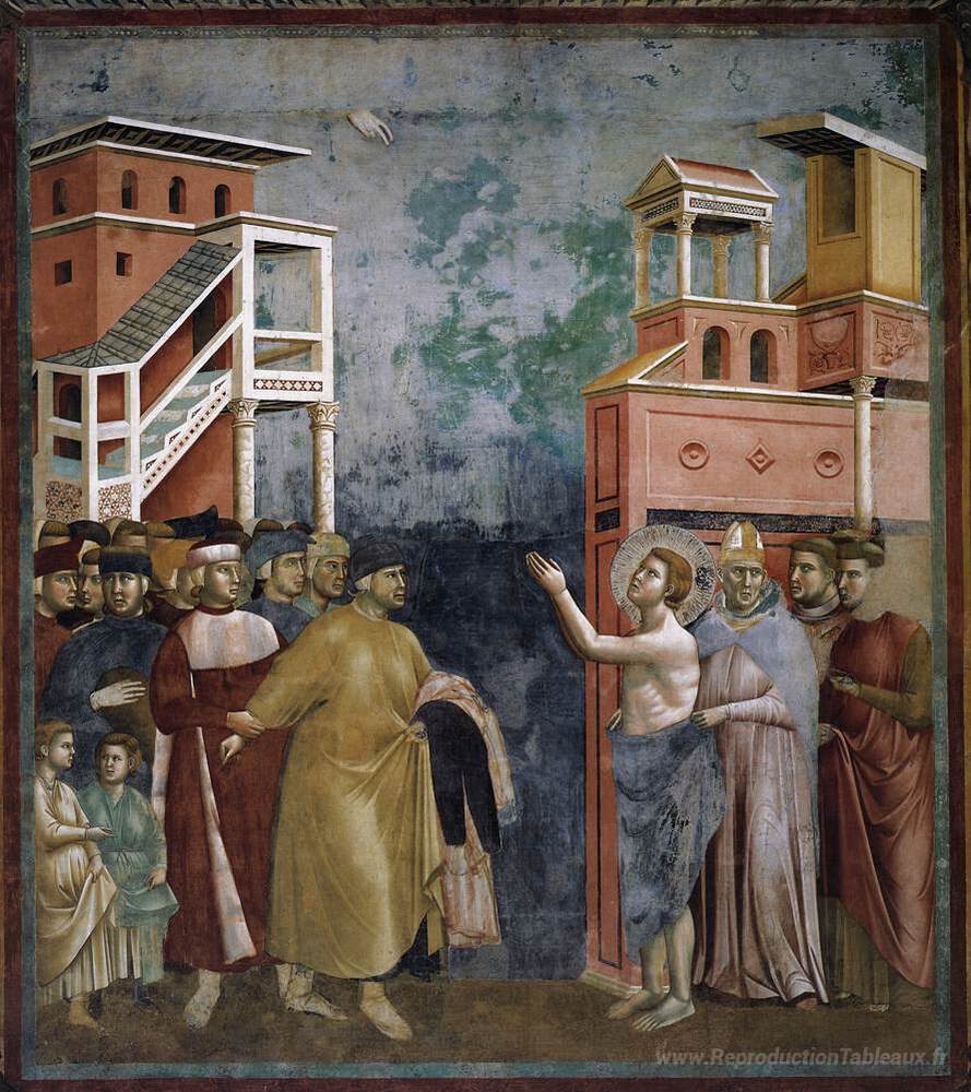 Nous vous proposons une reproduction artisanale sur toile du célèbre tableau 'Saint-François renonce à tous les biens du monde' de Giotto, provenant du Musée de la Reproduction.