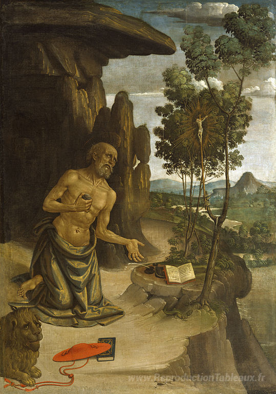 Nous vous proposons une reproduction artisanale sur toile du célèbre tableau 'Saint-Jérôme dans le désert' de Pinturicchio, provenant du Musée de la Reproduction.