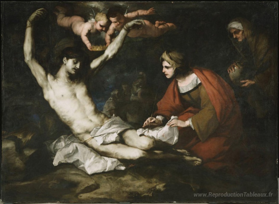 Nous vous proposons une reproduction artisanale sur toile du célèbre tableau 'Saint-Sébastian guéri par Irene' de Luca Giordano, provenant du Musée de la Reproduction.