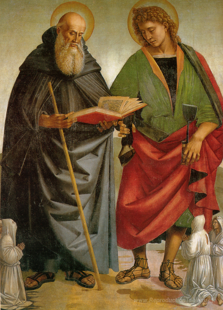 Nous vous proposons une reproduction artisanale sur toile du célèbre tableau 'Saints Eligius et Antonio' de Luca Signorelli, provenant du Musée de la Reproduction.