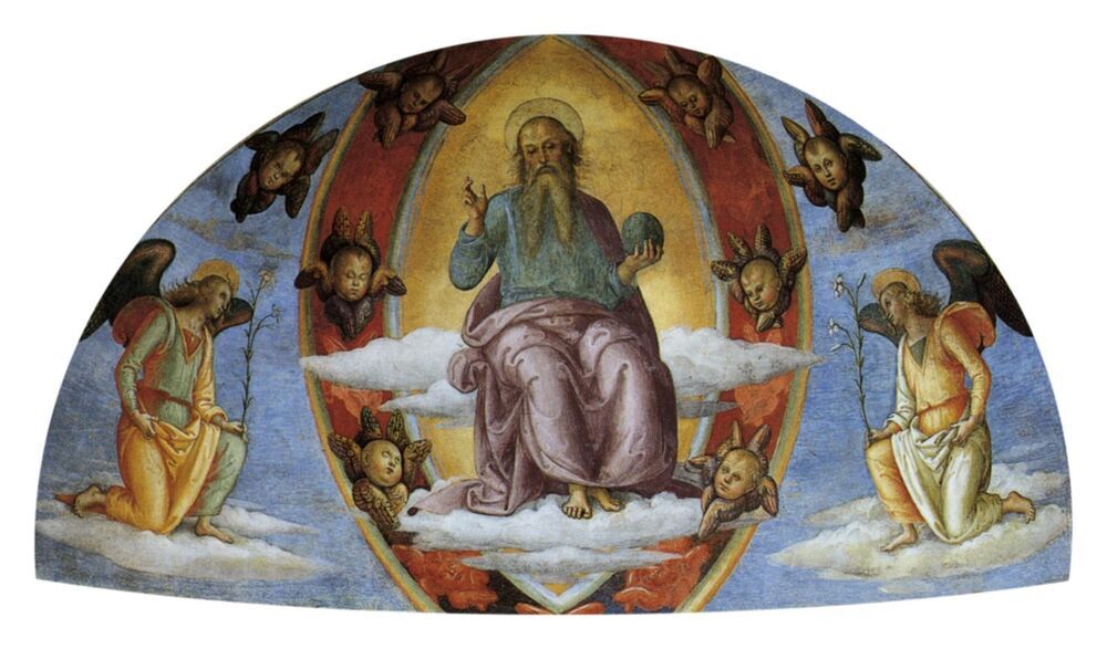 Nous vous proposons une reproduction artisanale sur toile du célèbre tableau 'Seigneur en gloire avec des anges. Annonciation' de Pietro Perugino, provenant du Musée de la Reproduction.