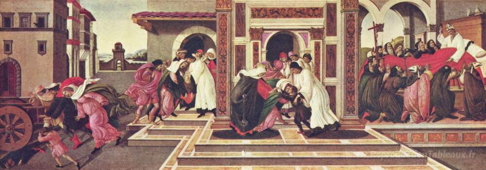 Nous vous proposons une reproduction artisanale sur toile du célèbre tableau 'Serie von vier Gem?lden zum Leben des Hl. Zanobi von Florenz' de Sandro Botticelli, provenant du Musée de la Reproduction.