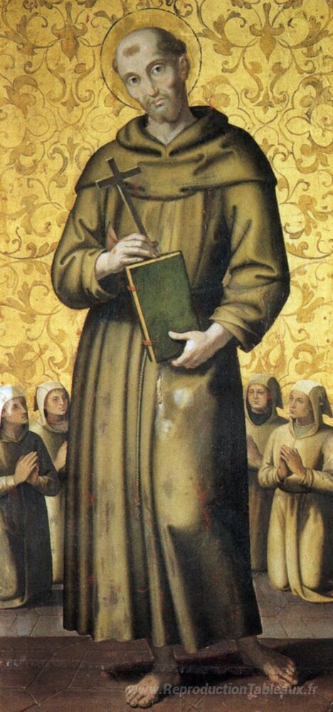 Nous vous proposons une reproduction artisanale sur toile du célèbre tableau 'St. Francis et les quatre obéissants' de Pietro Perugino, provenant du Musée de la Reproduction.