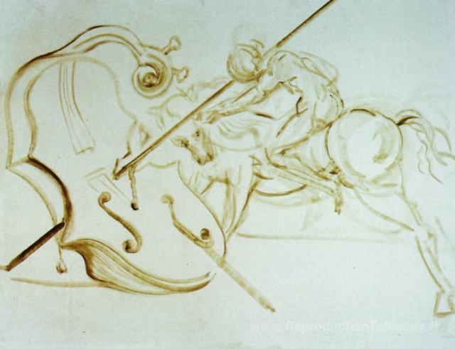 Nous vous proposons une reproduction artisanale sur toile du célèbre tableau 'St. George maîtrisant un violoncelle' de Salvador Dali, provenant du Musée de la Reproduction.