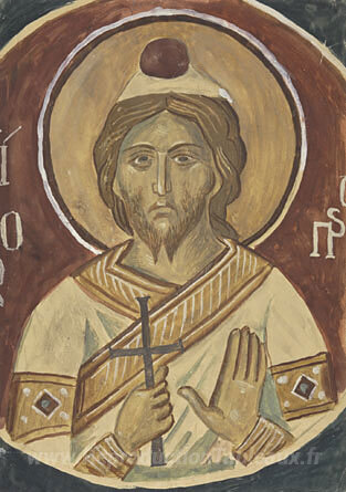 Nous vous proposons une reproduction artisanale sur toile du célèbre tableau 'St James le Persan, de Meteora 1931' de Yiannis Tsaroychis, provenant du Musée de la Reproduction.