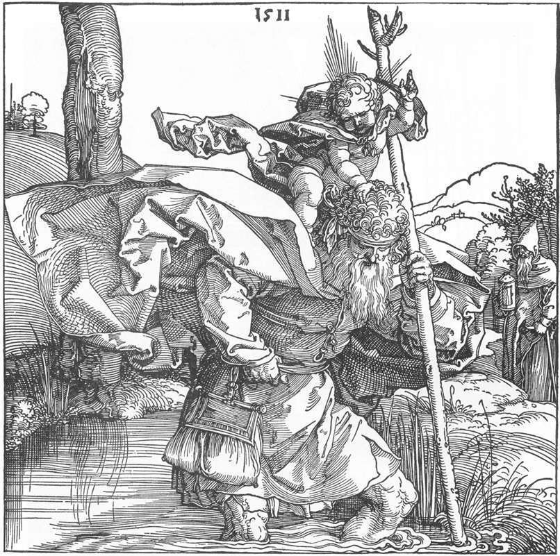 Nous vous proposons une reproduction artisanale sur toile du célèbre tableau 'St.Christopher portant l'enfant Christ' de Albrecht Durer, provenant du Musée de la Reproduction.