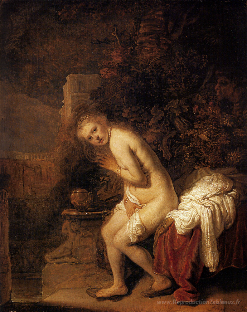 Nous vous proposons une reproduction artisanale sur toile du célèbre tableau 'Susanna et les anciens' de Rembrandt, provenant du Musée de la Reproduction.