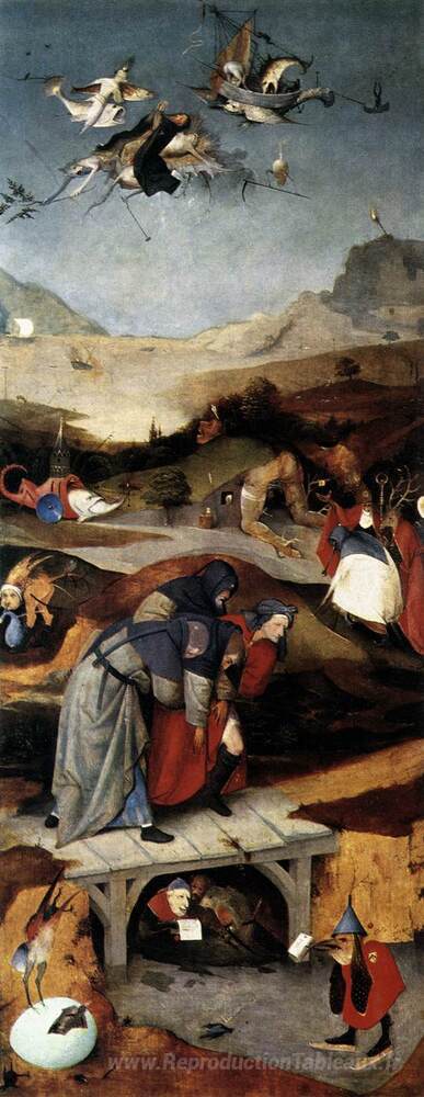 Nous vous proposons une reproduction artisanale sur toile du célèbre tableau 'Tentation de St. Anthony' de Hieronymus Bosch, provenant du Musée de la Reproduction.