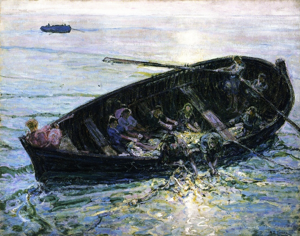 Nous vous proposons une reproduction artisanale sur toile du célèbre tableau 'Transport miraculeux de poissons' de Henry Ossawa Tanner, provenant du Musée de la Reproduction.