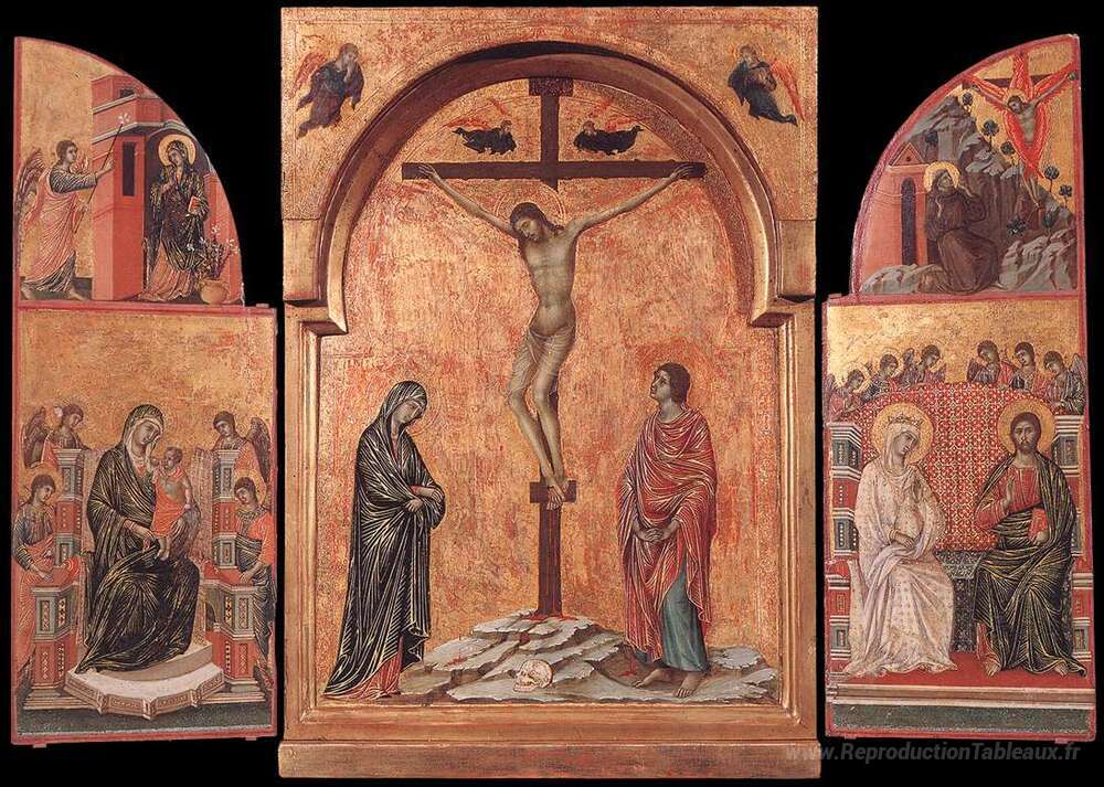 Nous vous proposons une reproduction artisanale sur toile du célèbre tableau 'Triptyque' de Duccio, provenant du Musée de la Reproduction.