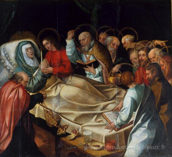Nous vous proposons une reproduction artisanale sur toile du célèbre tableau 'Tr?nsito da virgem' de Cristovao de Figueiredo, provenant du Musée de la Reproduction.