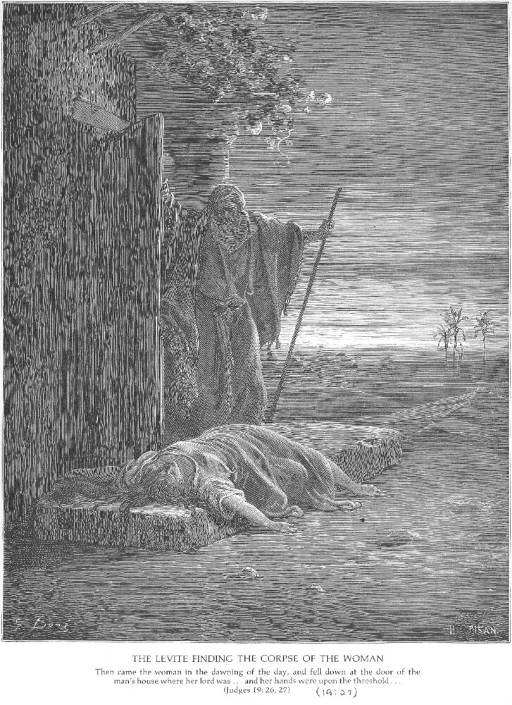 Nous vous proposons une reproduction artisanale sur toile du célèbre tableau 'Un Lévite trouve un cadavre d'une femme' de Gustave Dore, provenant du Musée de la Reproduction.
