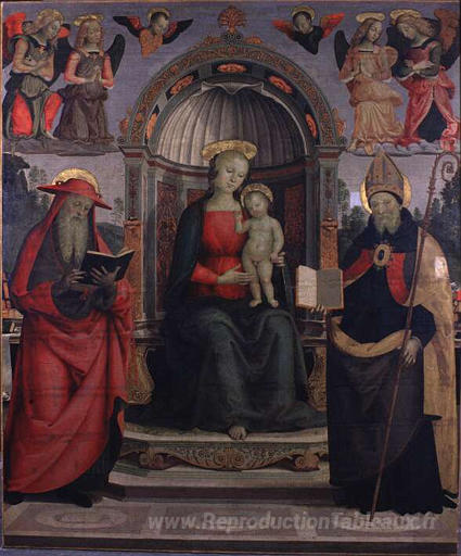 Nous vous proposons une reproduction artisanale sur toile du célèbre tableau 'Vierge et Saint Jérôme et St.Agustine' de Pietro Perugino, provenant du Musée de la Reproduction.