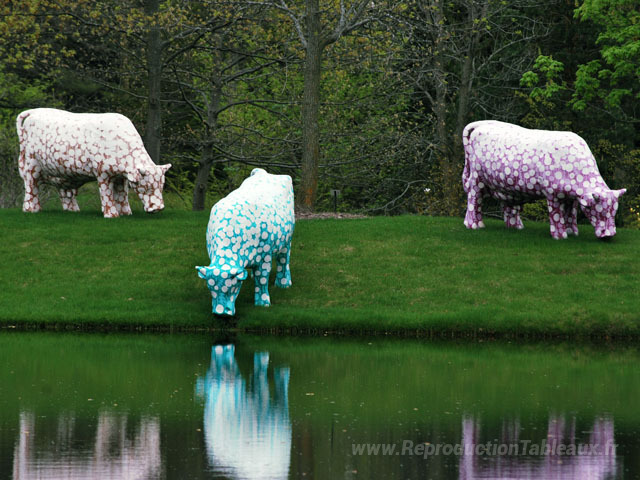 Nous vous proposons une reproduction artisanale sur toile du célèbre tableau 'Des Vaches: Mo, Ni, Que' de Samuel Buri, provenant du Musée de la Reproduction.