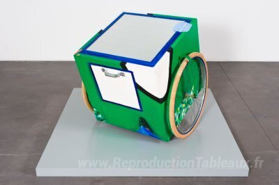 Nous vous proposons une reproduction artisanale sur toile du célèbre tableau 'Le chariot pour déplacer le ciel' de Roger Raveel, provenant du Musée de la Reproduction.