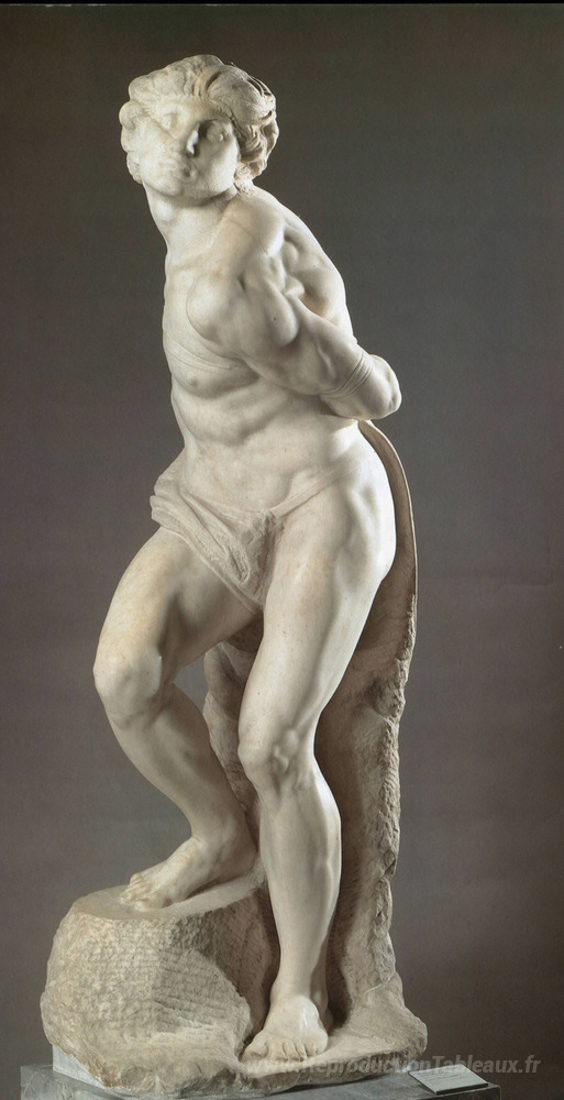 Nous vous proposons une reproduction artisanale sur toile du célèbre tableau 'L'esclave rebelle' de Michelangelo, provenant du Musée de la Reproduction.