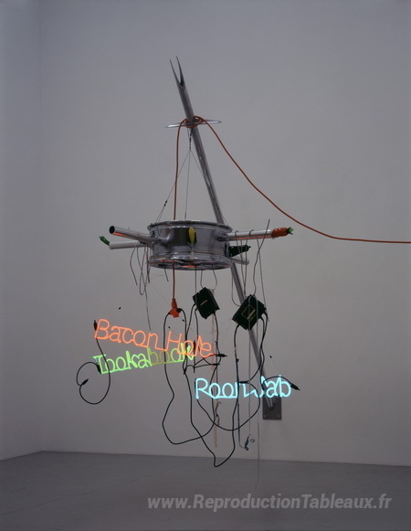 Nous vous proposons une reproduction artisanale sur toile du célèbre tableau 'Lustre 9' de Jason Rhoades, provenant du Musée de la Reproduction.