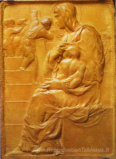 Nous vous proposons une reproduction artisanale sur toile du célèbre tableau 'Madonna des escaliers' de Michelangelo, provenant du Musée de la Reproduction.