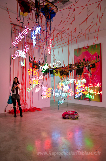 Nous vous proposons une reproduction artisanale sur toile du célèbre tableau 'Sans titre (lustre)' de Jason Rhoades, provenant du Musée de la Reproduction.
