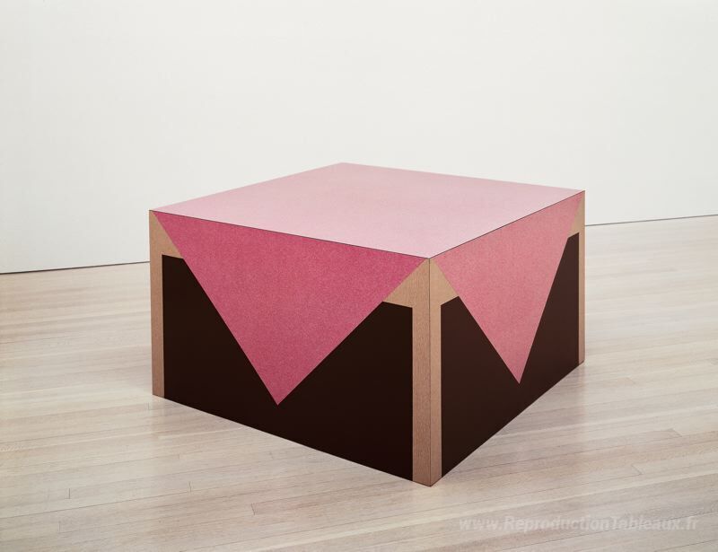 Nous vous proposons une reproduction artisanale sur toile du célèbre tableau 'Table avec nappe rose' de Richard Artschwager, provenant du Musée de la Reproduction.