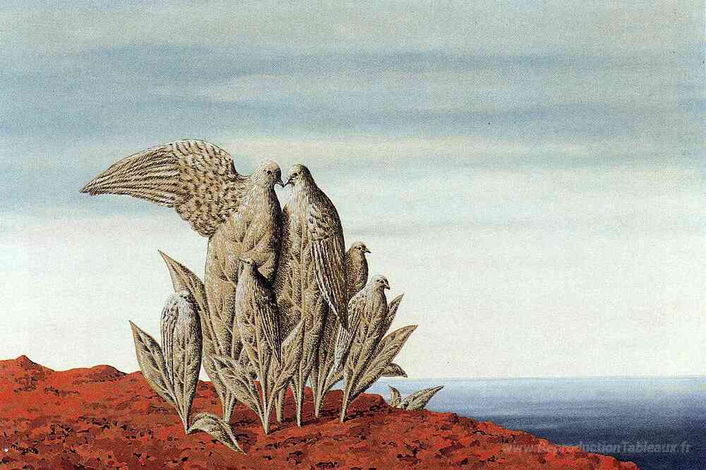 Nous vous proposons une reproduction artisanale sur toile du célèbre tableau 'Île des trésors' de Rene Magritte, provenant du Musée de la Reproduction.
