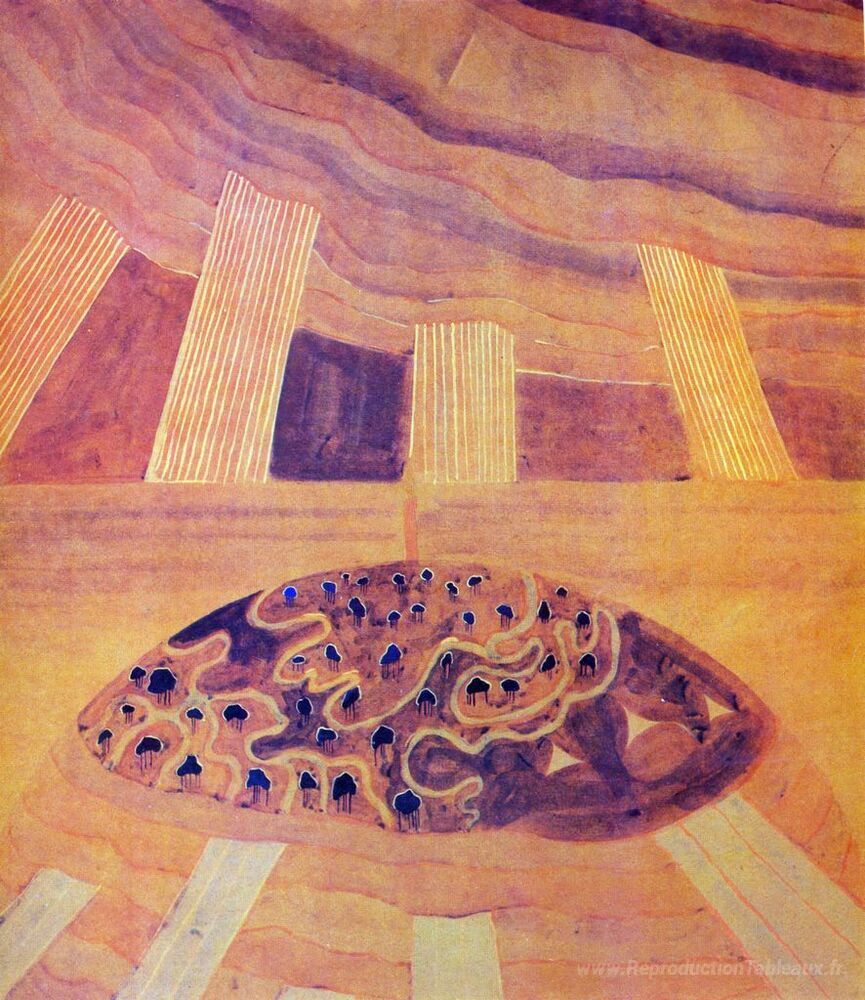 Nous vous proposons une reproduction artisanale sur toile du célèbre tableau 'Andante (sonate du soleil)' de Mikalojus Ciurlionis, provenant du Musée de la Reproduction.