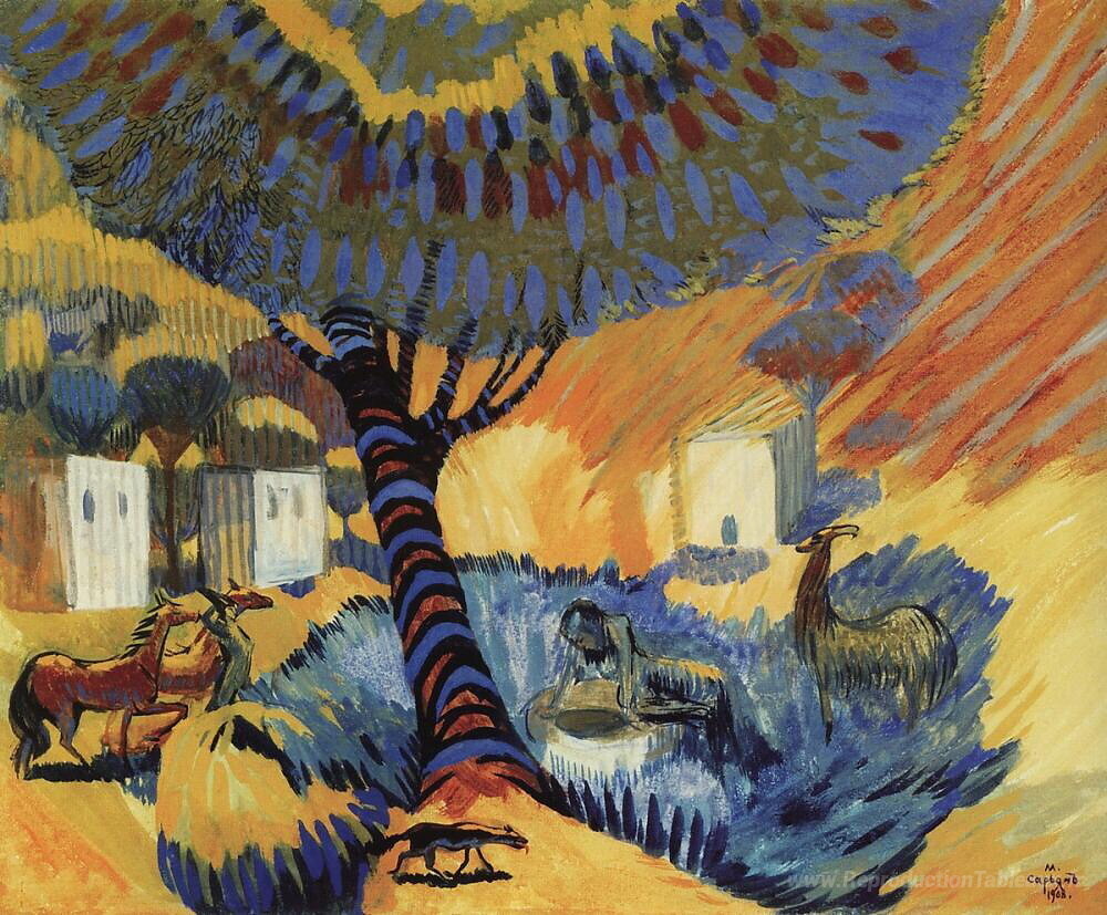 Nous vous proposons une reproduction artisanale sur toile du célèbre tableau 'Au puits' de Martiros Saryan, provenant du Musée de la Reproduction.