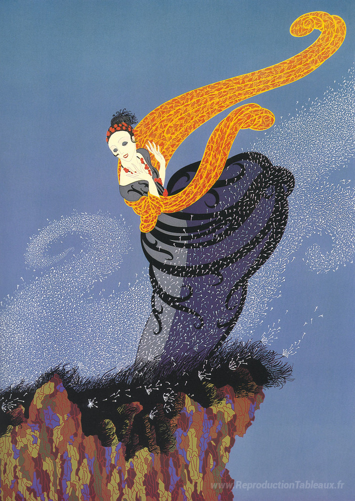 Nous vous proposons une reproduction artisanale sur toile du célèbre tableau 'Brise d'été' de Erte, provenant du Musée de la Reproduction.