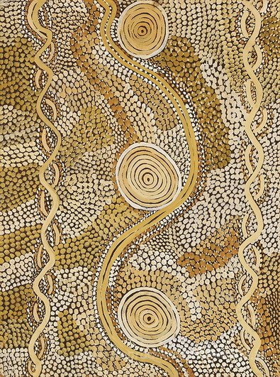 Nous vous proposons une reproduction artisanale sur toile du célèbre tableau 'Bush Tucker après la pluie' de Johnny Warangkula Tjupurrula, provenant du Musée de la Reproduction.