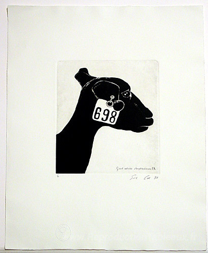 Nous vous proposons une reproduction artisanale sur toile du célèbre tableau 'Chèvre' de Sue Coe, provenant du Musée de la Reproduction.