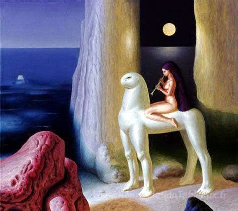 Nous vous proposons une reproduction artisanale sur toile du célèbre tableau 'Chanson entre le jour et la nuit' de Sabin Balasa, provenant du Musée de la Reproduction.