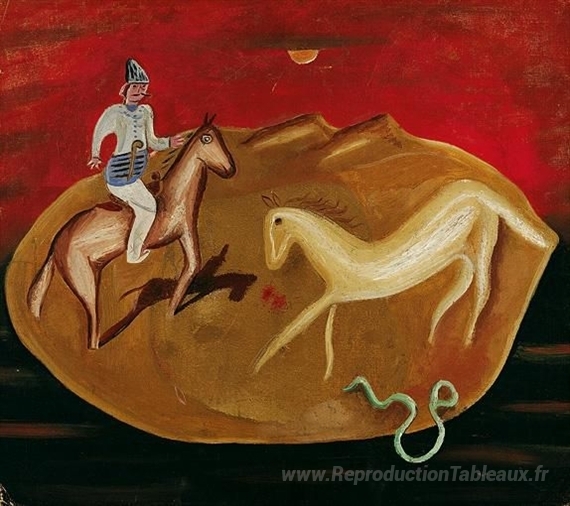 Nous vous proposons une reproduction artisanale sur toile du célèbre tableau 'Chevalier, cheval blanc et serpent' de Victor Brauner, provenant du Musée de la Reproduction.