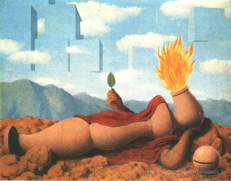 Nous vous proposons une reproduction artisanale sur toile du célèbre tableau 'Cosmogonie élémentaire' de Rene Magritte, provenant du Musée de la Reproduction.