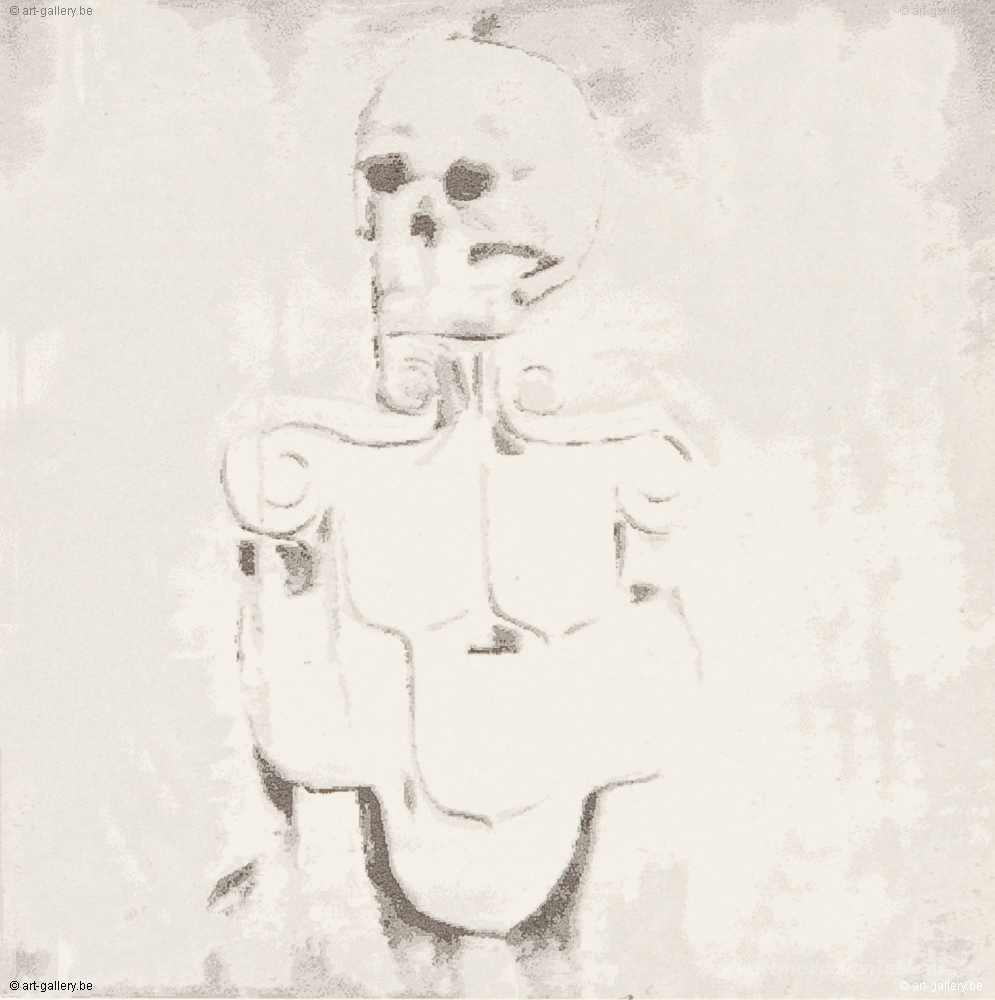 Nous vous proposons une reproduction artisanale sur toile du célèbre tableau 'Crâne mort' de Luc Tuymans, provenant du Musée de la Reproduction.