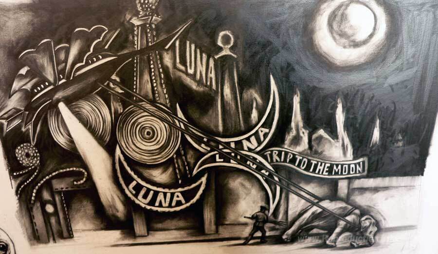 Nous vous proposons une reproduction artisanale sur toile du célèbre tableau 'Débordant' de Sue Coe, provenant du Musée de la Reproduction.
