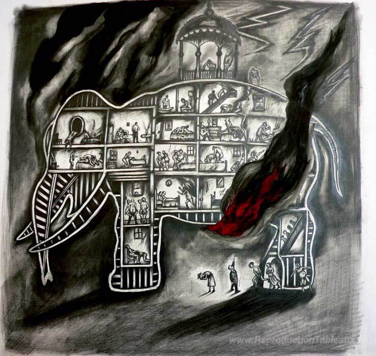 Nous vous proposons une reproduction artisanale sur toile du célèbre tableau 'Débordant' de Sue Coe, provenant du Musée de la Reproduction.