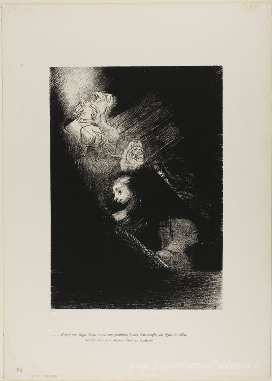 Nous vous proposons une reproduction artisanale sur toile du célèbre tableau 'D'abord une mare d'eau, puis une prostituée, le coin d'un temple' de Odilon Redon, provenant du Musée de la Reproduction.