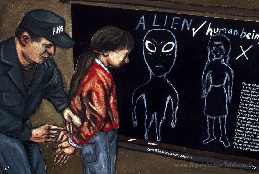 Nous vous proposons une reproduction artisanale sur toile du célèbre tableau 'Extraterrestre' de Sue Coe, provenant du Musée de la Reproduction.