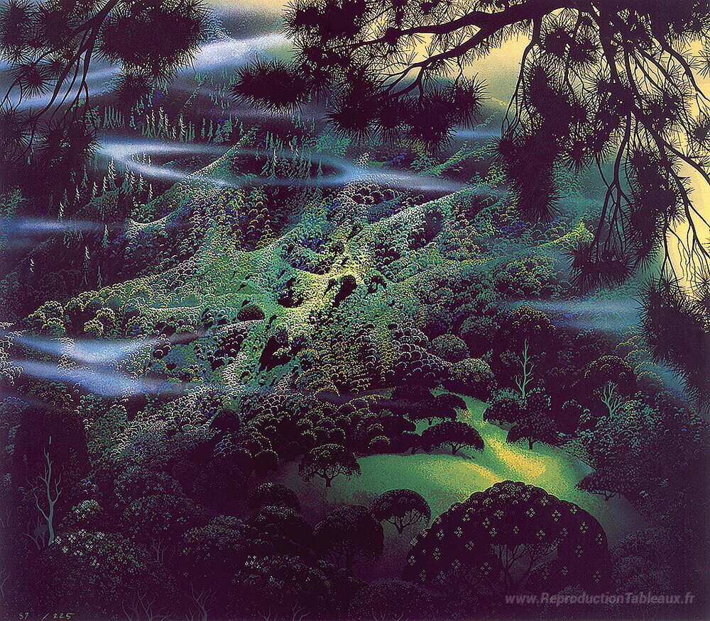 Nous vous proposons une reproduction artisanale sur toile du célèbre tableau 'Fantaisie symphonique' de Eyvind Earle, provenant du Musée de la Reproduction.