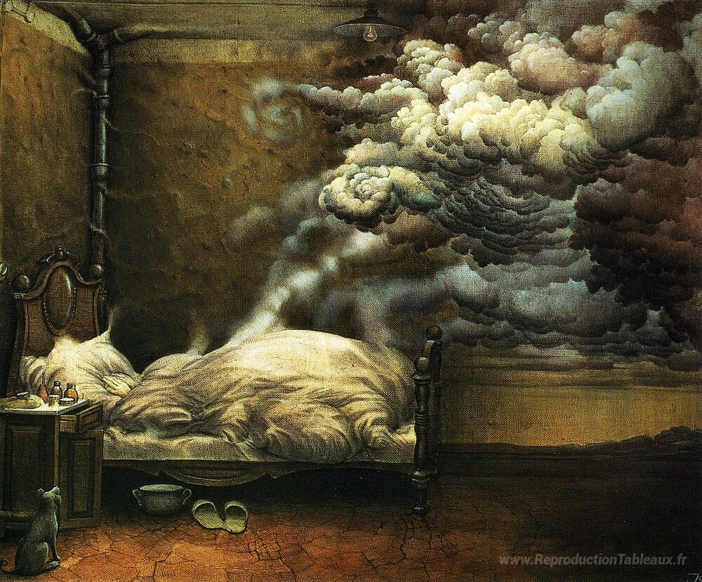 Nous vous proposons une reproduction artisanale sur toile du célèbre tableau 'Fièvre' de Jacek Yerka, provenant du Musée de la Reproduction.