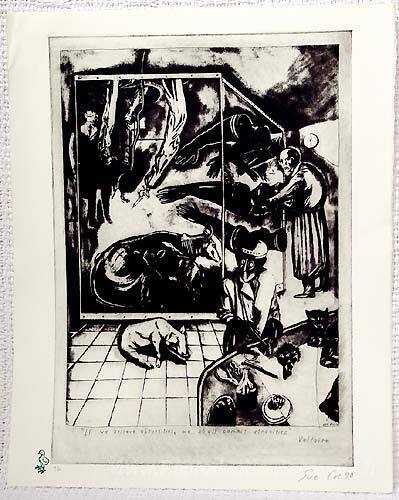 Nous vous proposons une reproduction artisanale sur toile du célèbre tableau 'Génotek' de Sue Coe, provenant du Musée de la Reproduction.