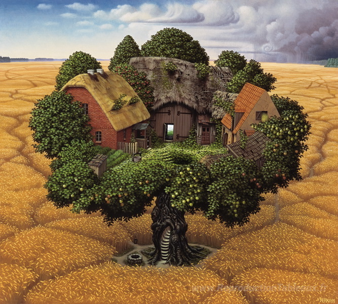 Nous vous proposons une reproduction artisanale sur toile du célèbre tableau 'Habitat' de Jacek Yerka, provenant du Musée de la Reproduction.