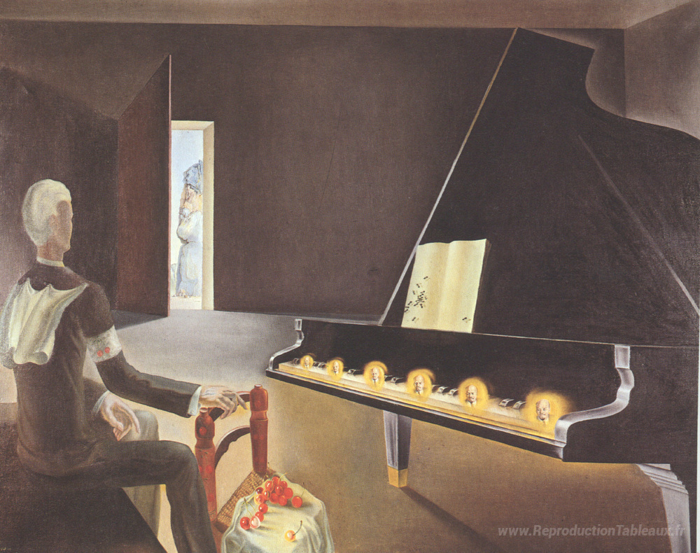 Nous vous proposons une reproduction artisanale sur toile du célèbre tableau 'Hallucination partielle: six apparitions de Lénine sur un piano' de Salvador Dali, provenant du Musée de la Reproduction.